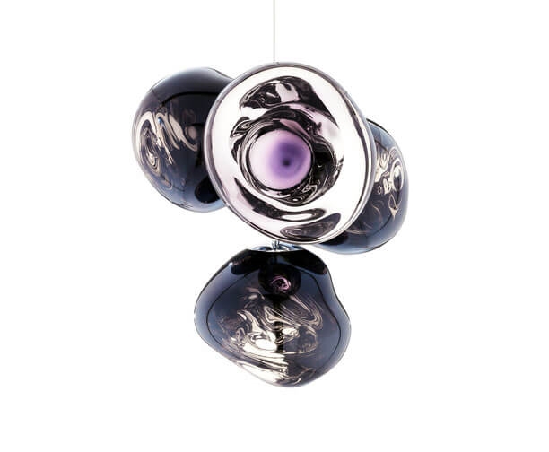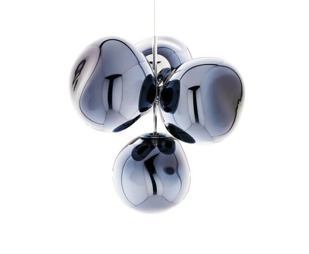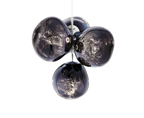 Melt kleine kroonluchter is een herinterpretatie van de moderne kroonluchter en bestaat uit vier gemetalliseerde onvolmaakte bolvormige kappen met een spiegeleffect, die zijn gemonteerd om een kleine cluster te vormen.