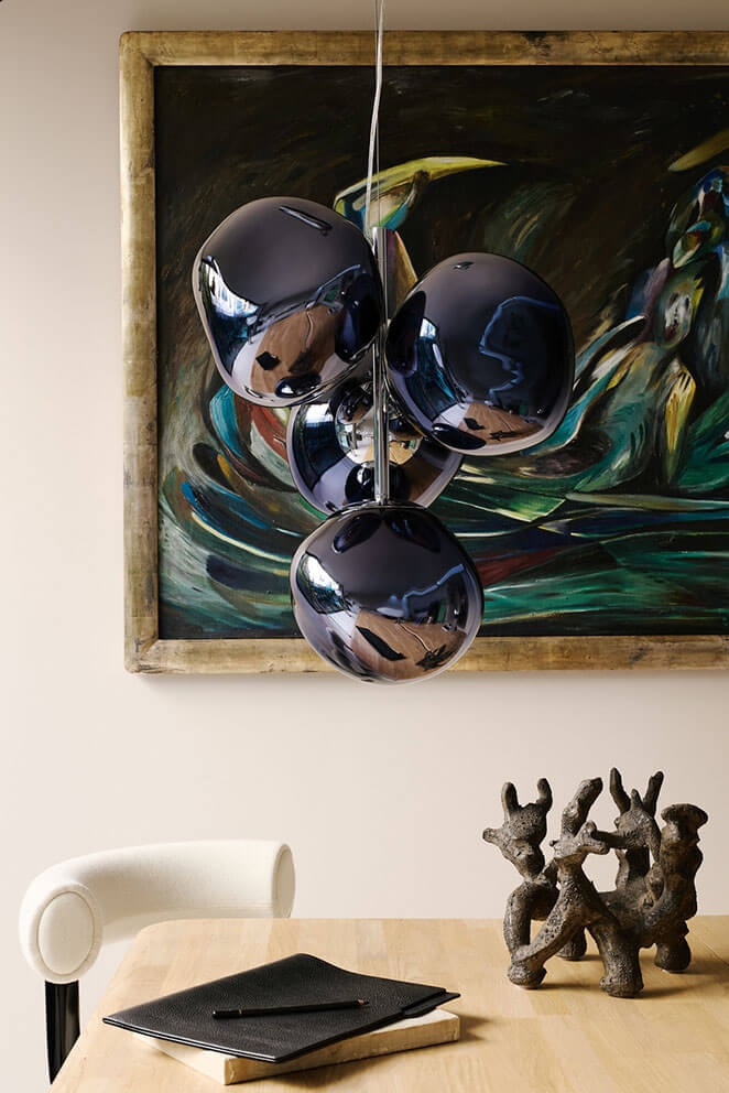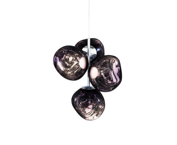 De Melt mini kroonluchter biedt de mogelijkheid om ook kleinere ruimtes te voorzien van een kroonluchter. De compacte miniversie van de kroonluchters van Tom Dixon heeft vier gemetalliseerde onvolmaakte bolvormige kappen met spiegeleffect, die zijn gemonteerd in een kleine cluster. De kroonluchter past goed in veel moderne interieurs.