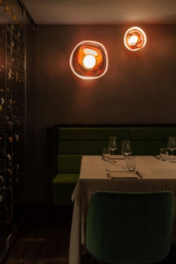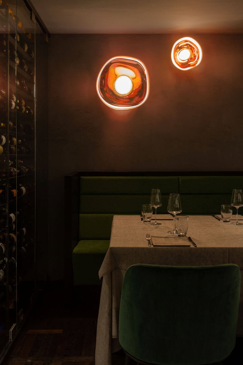 Melt Surface mini kan zowel als wandlamp als plafondlamp worden gebruikt en geeft met een speciale metallisering de onvolmaakte kap een glaseffect wanneer deze aan is, en een spiegelafwerking wanneer deze uit is.