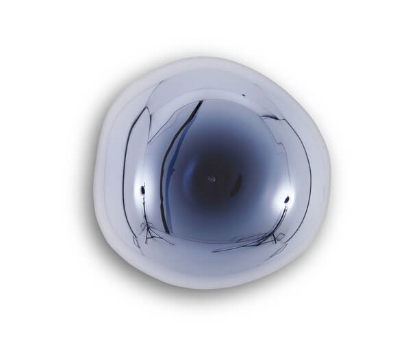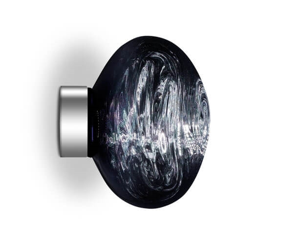 Melt Surface mini kan zowel als wandlamp als plafondlamp worden gebruikt en geeft met een speciale metallisering de onvolmaakte kap een glaseffect wanneer deze aan is, en een spiegelafwerking wanneer deze uit is.