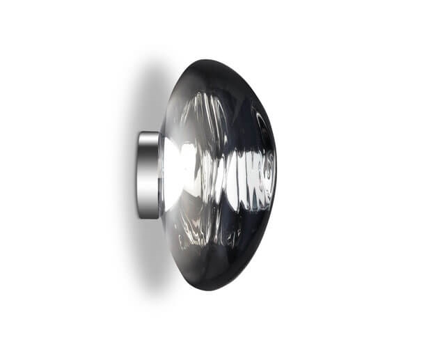 Melt Surface kan zowel als wandlamp als plafondlamp worden gebruikt en geeft met een speciale metallisatie de onvolmaakte kap een glaseffect wanneer deze aan is, en een spiegelafwerking wanneer deze uit is.