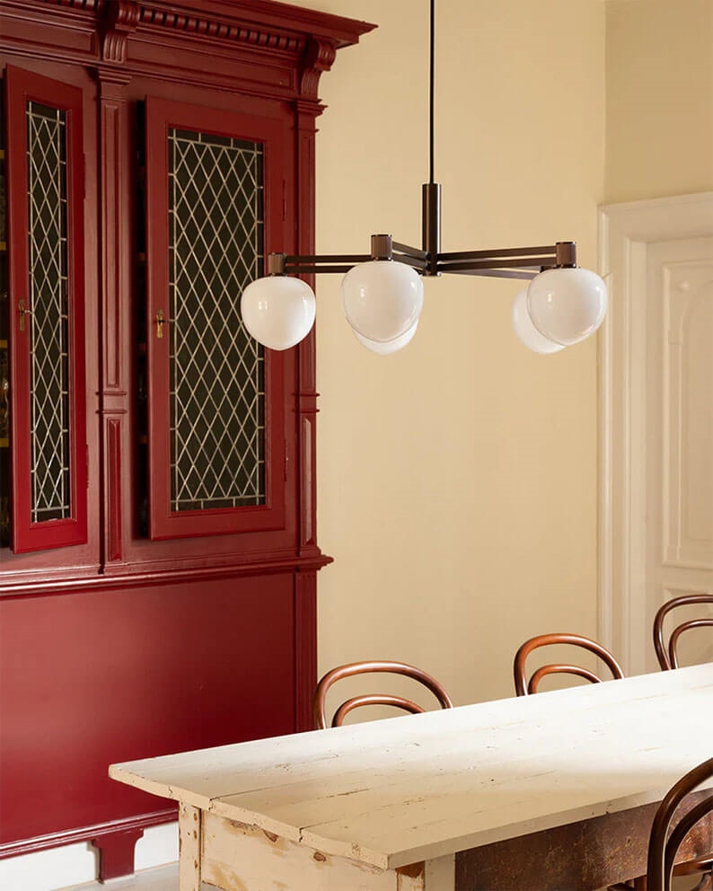 De kroonluchter bestaat uit een 3-laags opaalglas, dat prachtig wordt gecombineerd met details in brons. Het dikke opaalglas schermt de lichtbron af, zodat het verblindingsvrij en gelijkmatig in de ruimte verschijnt. De kroonluchter zou perfect zijn boven de keuken- of salontafel.