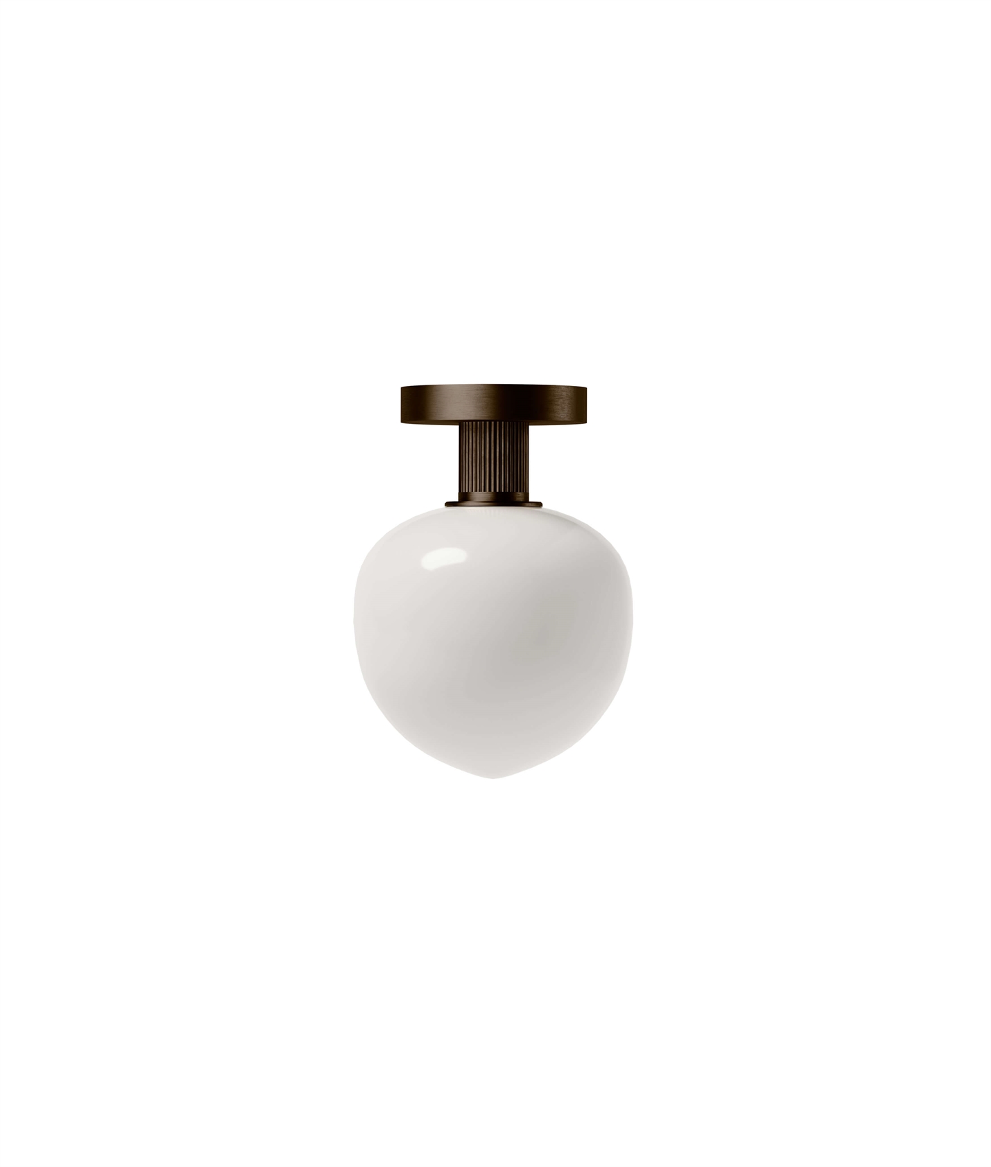 De plafondlamp bestaat uit een 3-laags opaalglas, dat prachtig wordt gecombineerd met details in brons. Het dikke opaalglas schermt de lichtbron af, zodat het verblindingsvrij en gelijkmatig in de ruimte verschijnt. De plafondlamp neemt niet veel ruimte in beslag en past daarom op veel plaatsen in het interieur, zowel alleen als samen met andere Memoir lampen.