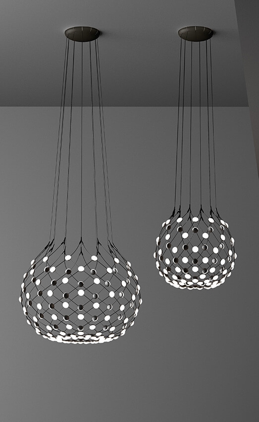 Mesh heeft een uniek ontwerp en biedt een groot theatraleffect op de plek waar hij hangt. Door de vorm van de lamp wordt er een grote lichtverdeling bereikt. Het zou daarom essentieel kunnen zijn om deze boven een eettafel te hangen.