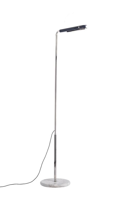 De prachtige vloerlamp heeft een basis van wit marmer en een standaard met een afwerking in chroom en kan in hoogte worden versteld via een telescoopsysteem. De kap van gekleurd aluminium kan worden gekanteld, zodat de richting van het licht kan worden veranderd.