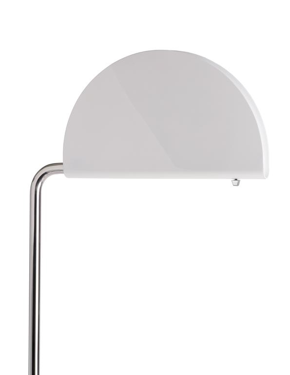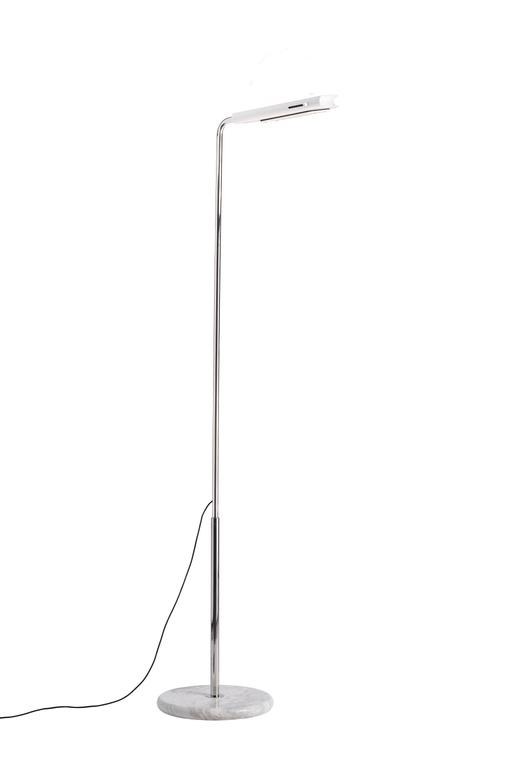 De prachtige vloerlamp heeft een basis van wit marmer en een standaard met een chromen afwerking en kan in hoogte worden versteld via een telescoopsysteem. De kap van gekleurd aluminium kan worden gekanteld, zodat de richting van het licht kan worden veranderd.