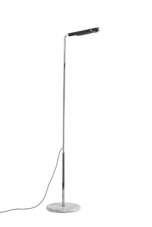 De prachtige vloerlamp heeft een basis van wit marmer en een standaard met een chromen afwerking en kan in hoogte worden versteld via een telescoopsysteem. De kap van gekleurd aluminium kan worden gekanteld om de richting van het licht te veranderen.