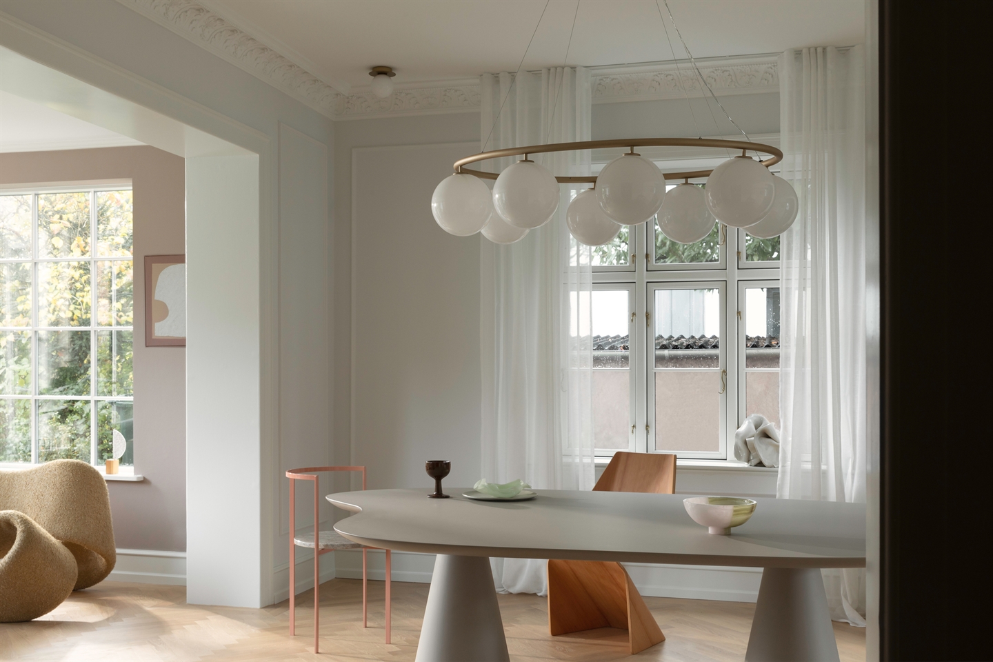 Miira 8 Oval kroonluchter met 8 opaalglazen bollen is bijzonder geschikt als grote eettafellamp.