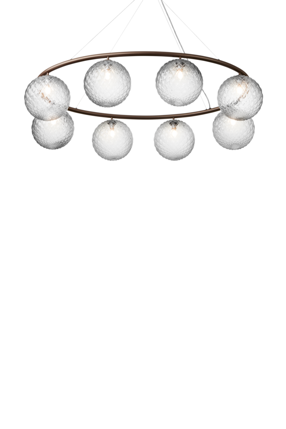 De Miira-kroonluchter bestaat uit een metalen ring van geanodiseerd aluminium in een donker bronskleur. Van hieruit verspreiden de prachtige mondgeblazen glazen bollen een sfeervol licht. Het eenvoudige en klassieke ontwerp maakt de kroonluchter zeer geschikt voor vele interieurs.