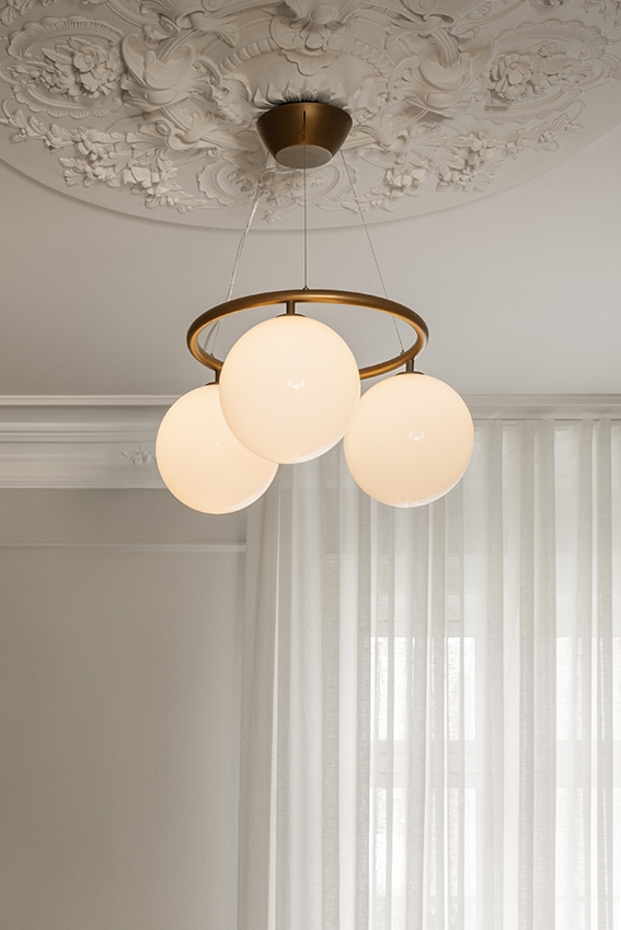 Miira-kroonluchter bestaat uit een gepoedercoate metalen ring in messing. Van hieruit verspreiden de prachtige mondgeblazen glazen bollen in helder optisch glas een zintuiglijk licht. Het eenvoudige en klassieke ontwerp maakt de kroonluchter uiterst geschikt voor vele interieurs.