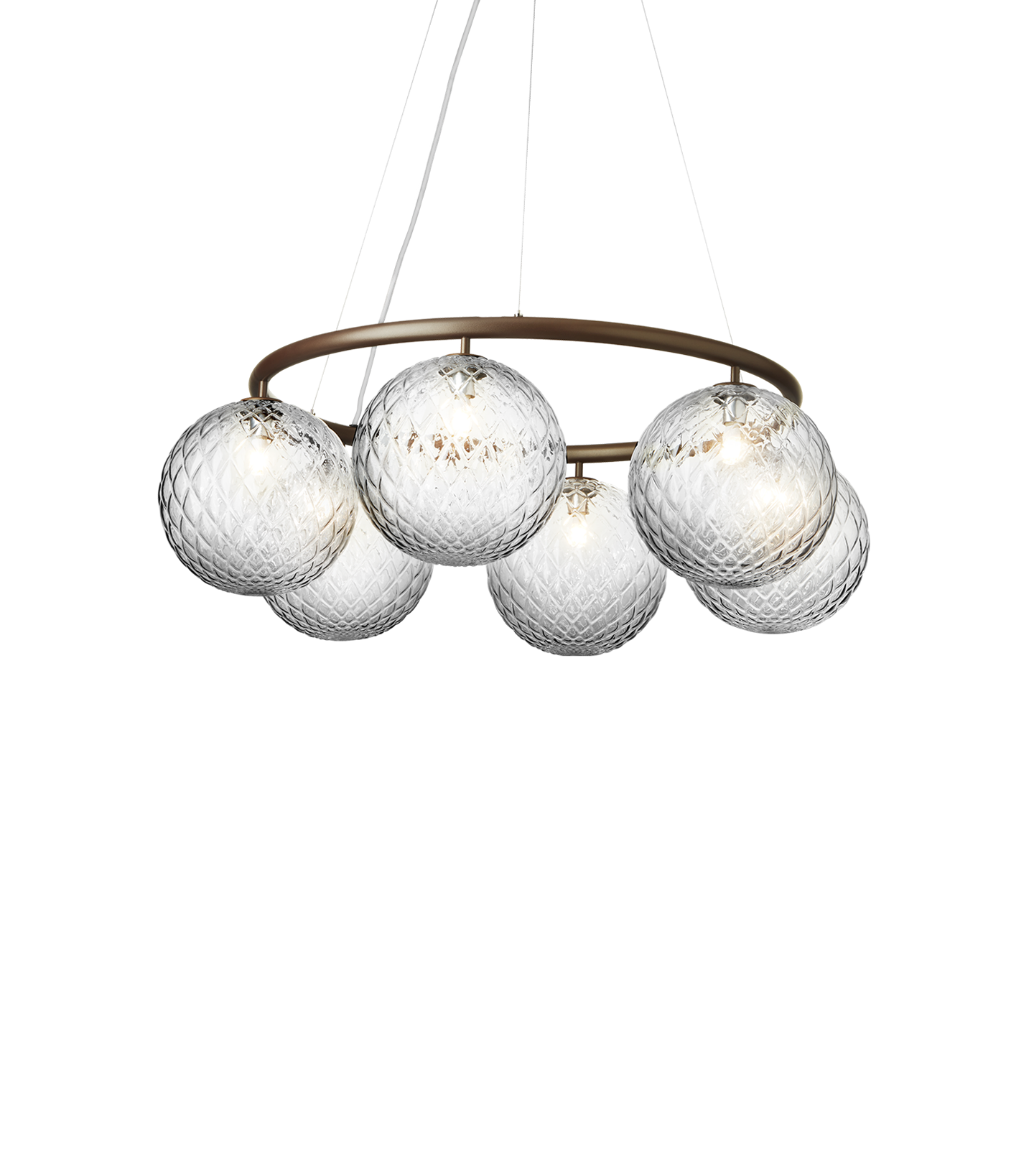 Miira 6 Circular, bestaande uit zes mondgeblazen glazen bollen, heeft een diameter van 80 cm. Dit maakt de kroonluchter bijzonder geschikt boven een eettafel of zithoek.