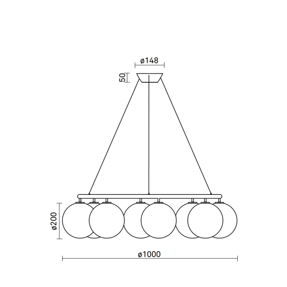 Miira 8 Circular met acht glazen bollen heeft een diameter van 100 cm. De grotere kroonluchter is bijzonder geschikt boven de grote eettafel of als prachtige verlichting in de grote entree of hal.