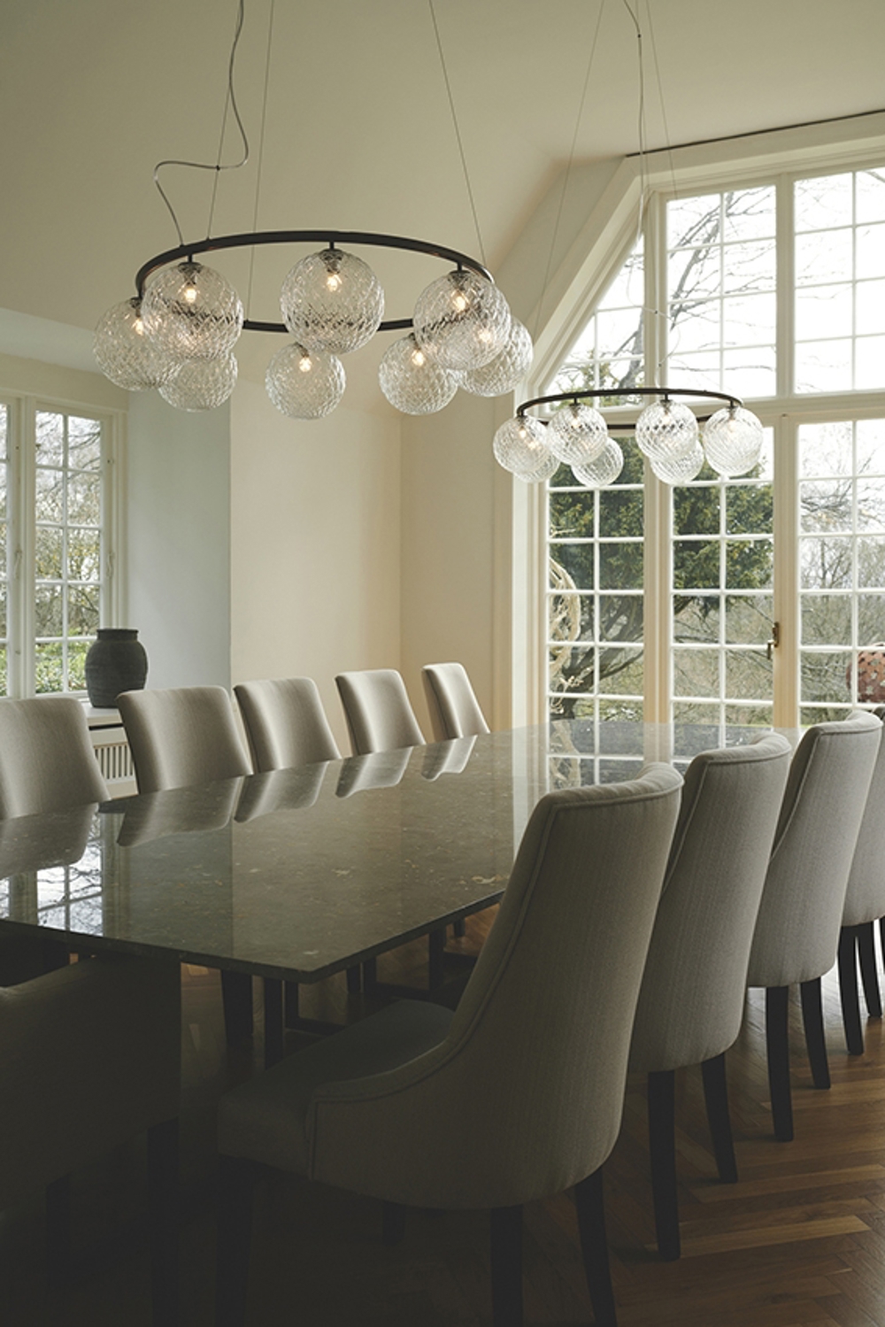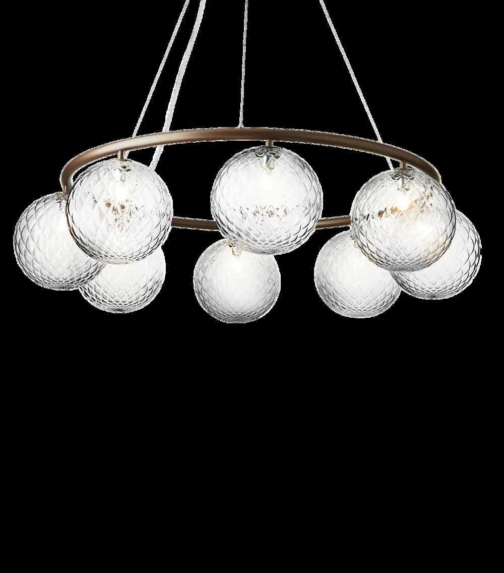 Miira 8 Circular met acht glazen bollen heeft een diameter van 100 cm. De grotere kroonluchter is bijzonder geschikt boven de grote eettafel of als mooie verlichting in de grote entree of hal.
