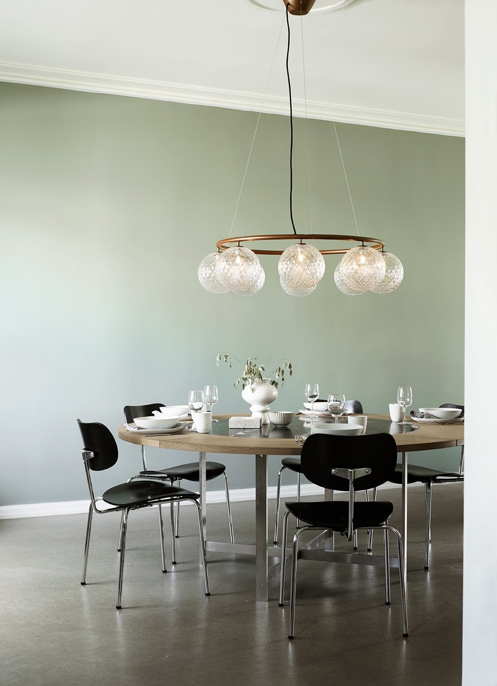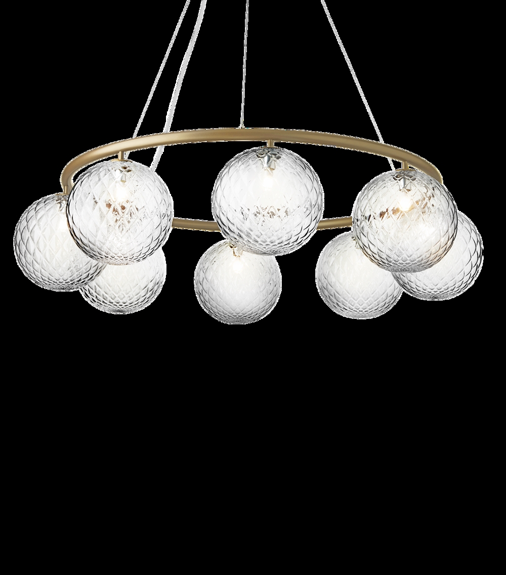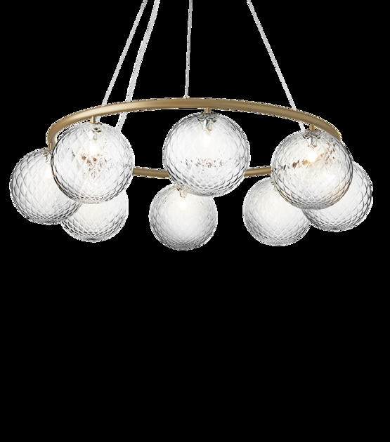 Miira 8 Circular met acht glazen bollen heeft een diameter van 100 cm. De grotere kroonluchter is bijzonder geschikt boven de grote eettafel of als mooie verlichting in de grote entree of hal.