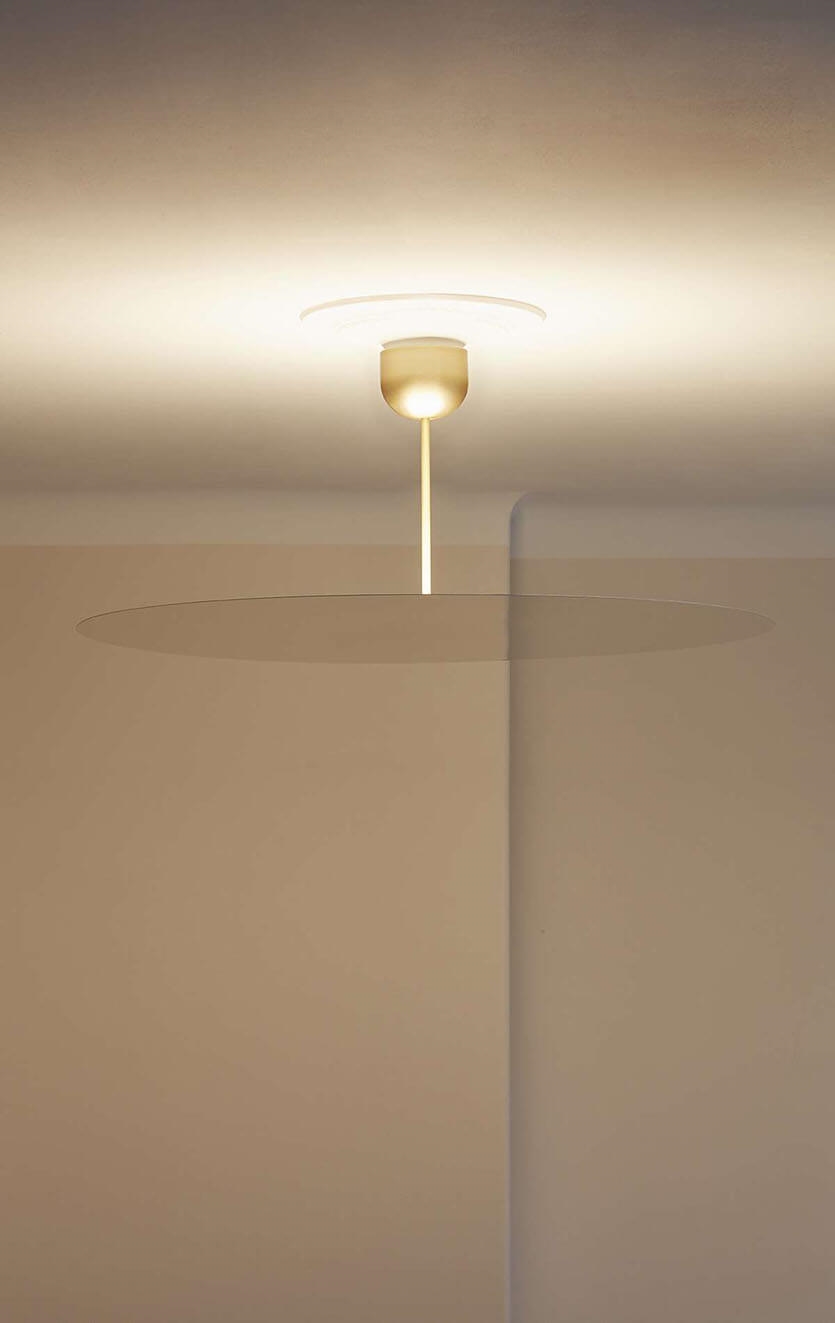 Millimetro is met zijn vaste stang tussen plafond en kap een kruising tussen een klassieke plafondlamp en een hanglamp. De dunne kap met spiegeleffect verbergt de lichtbron, die een gelijkmatig zacht licht uitstraalt.