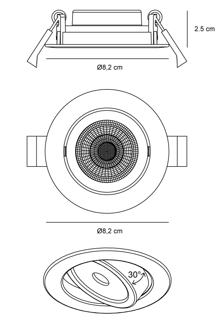 De inbouwspot Monolo heeft een geïntegreerde LED-lichtbron, die in drie stappen dimbaar is met Moodmaker™ via de gewone wandschakelaar, zodat de lichtsterkte eenvoudig aan de situatie kan worden aangepast. Monolo kan gericht licht leveren, omdat de spot 30° kan worden gekanteld.
