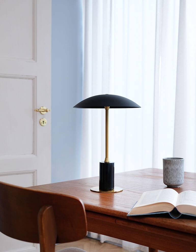 De oplaadbare tafellamp Moon is draadloos en kan gemakkelijk worden verplaatst, zodat het zachte en aangename licht overal in je huis kan worden verspreid waar nodig. Met zijn zwarte metalen kap, messing lampenstandaard en marmeren voet heeft de lamp een elegant Scandinavisch design, waardoor hij perfect is voor plaatsing op het bureau, in de woonkamer of een andere plek waar verlichting in een eenvoudige stijl gewenst is.