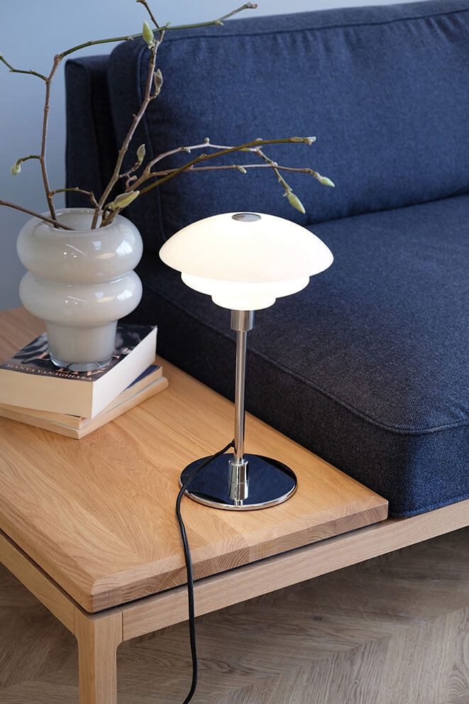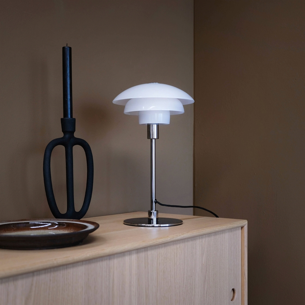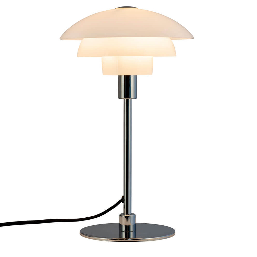 Dyberg Larsen Morph D21 tafellamp, opaal/chroom - ontworpen door Frank Kerdil