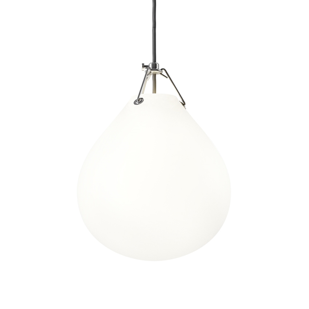 De lamp heeft een druppelvorm en is gemaakt van mat wit opaalglas, dat zorgt voor een diffuus, verblindingsvrij licht in elke ruimte.