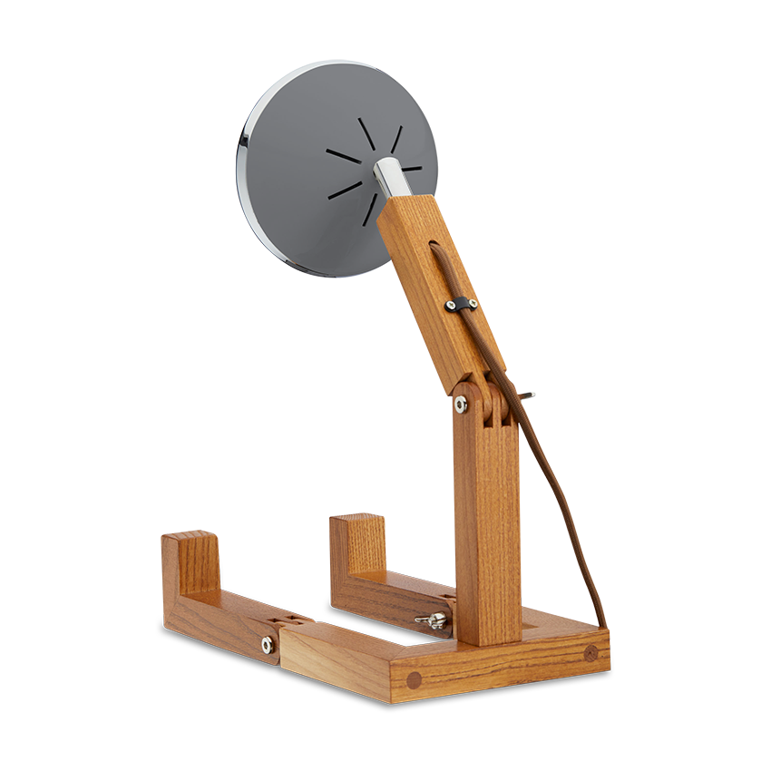 Mr. Wattson is gemaakt van essenhout, aluminium en metaal.