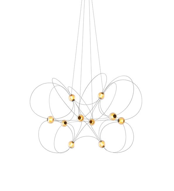 Munari straalt een krachtig maar dromerig licht uit en is verkrijgbaar met 6, 8 of 10 bolvormige kappen en een structuur in zwart of goud. Een voor de hand liggende keuze voor de woonkamer en eetkamer of een hal met een hoog plafond.