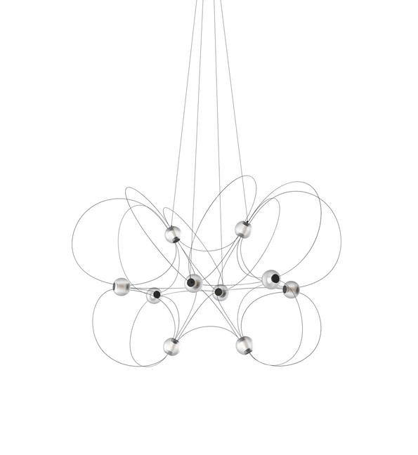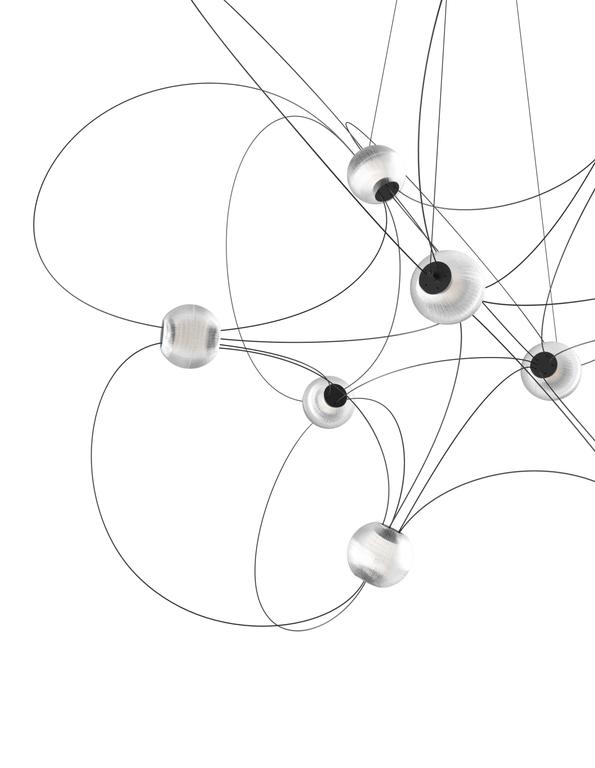 De kroonluchter Munari met 10 bolvormige kappen is een sculpturale en grafische toevoeging aan het interieur met een licht en elegant ontwerp. De structuur met een balans tussen zwarte staven en lichtgevende bollen met geïntegreerde LED-lichtbronnen doet denken aan een constellatie van kosmische planeten, lichtgevende atomen of magnetische veldlijnen.
