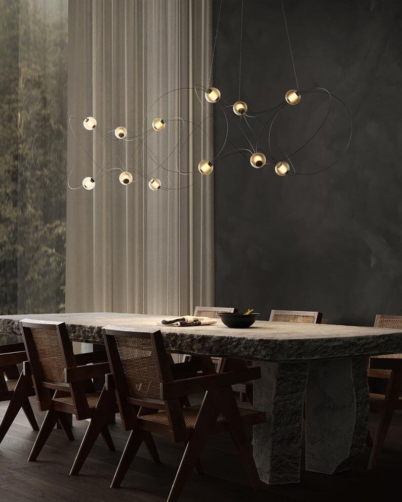 De kroonluchter Munari met 6 bolvormige kappen is een sculpturale en grafische toevoeging aan het interieur met een licht en elegant ontwerp. De structuur met een balans tussen zwarte staven en lichtgevende bollen met geïntegreerde LED-lichtbronnen doet denken aan een constellatie van kosmische planeten, lichtgevende atomen of magnetische veldlijnen.