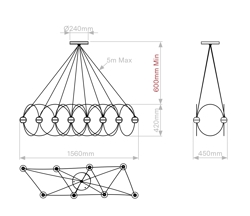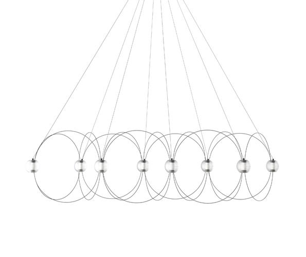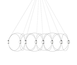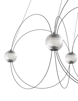 De kroonluchter Munari met 8 bolvormige kappen is een sculpturale en grafische toevoeging aan het interieur met een licht en elegant ontwerp. De structuur met een balans tussen zwarte staven en lichtgevende bollen met geïntegreerde LED-lichtbronnen doet denken aan een constellatie van kosmische planeten, lichtgevende atomen of magnetische veldlijnen.