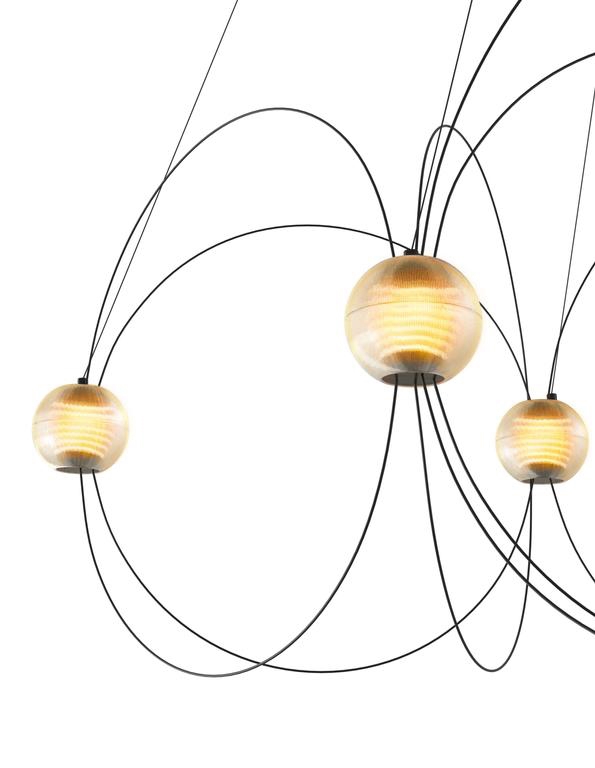 Munari straalt een krachtig maar dromerig licht uit en is verkrijgbaar met 6, 8 of 10 bolvormige kappen en een structuur in zwart of goud. Een voor de hand liggende keuze voor de woonkamer, eetkamer of een hal met hoge plafonds.