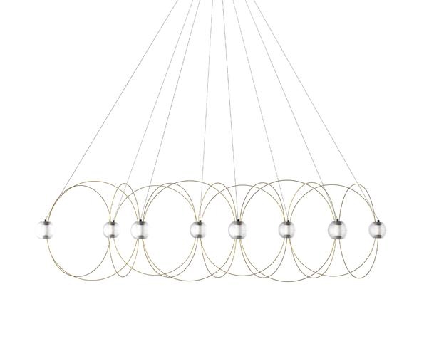 De kroonluchter Munari met 8 bolvormige kappen is een sculpturale en grafische toevoeging aan het interieur met een licht en elegant ontwerp. De structuur met een balans tussen staven met een gouden afwerking en lichtgevende bollen met geïntegreerde LED-lichtbronnen doet denken aan een constellatie van kosmische planeten, lichtgevende atomen of magnetische veldlijnen.