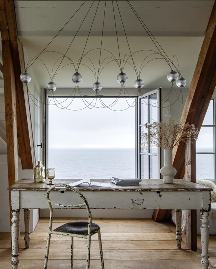 Munari straalt een krachtig maar dromerig licht uit en is verkrijgbaar met 6, 8 of 10 bolvormige kappen en een structuur in zwart of goud. Een voor de hand liggende keuze voor de woonkamer en eetkamer of een hal met een hoog plafond.