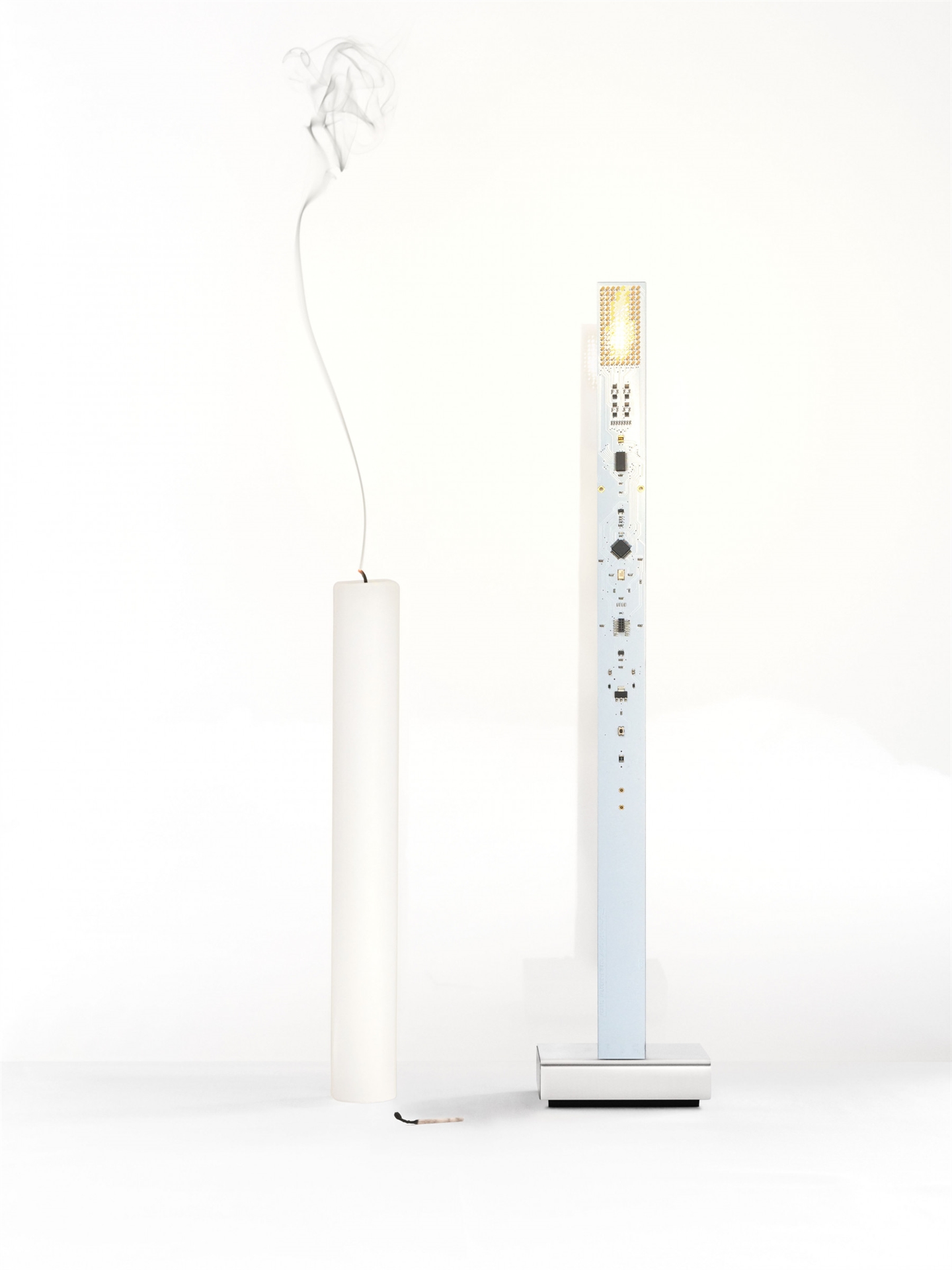 Ingo Maurer My New Flame tafellamp in wit – ontworpen in 2012 door Moritz Waldemeyer en Ingo Maurer