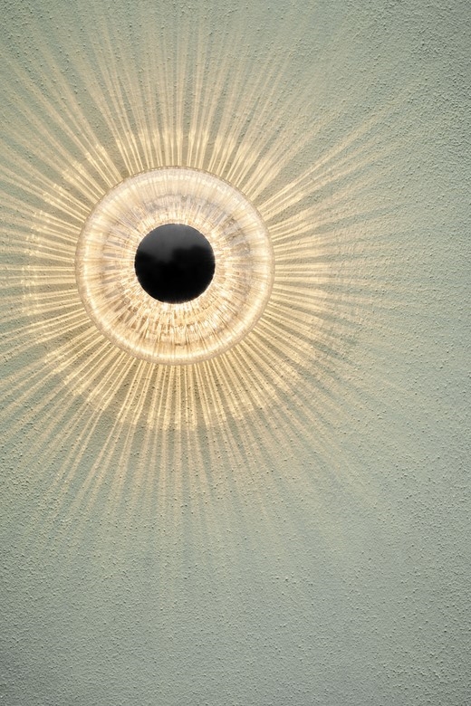 De populaire New Wave Optic wandlamp is naar buiten verplaatst met deze prachtige versie van een buitenlamp. Het mondgeblazen gegolfde glas creëert prachtige decoraties op elke buitenmuur. Kan met classificatie IP65 ook in de badkamer worden gebruikt.