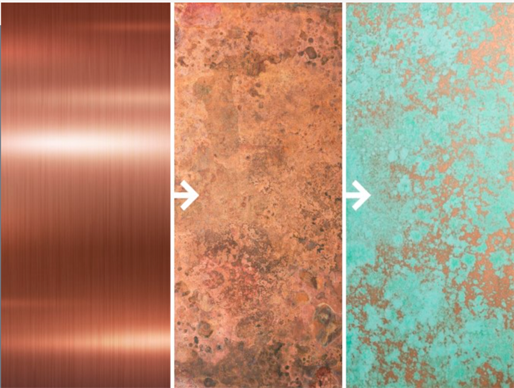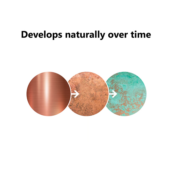 Na verloop van tijd zal blootstelling aan wind en weer ervoor zorgen dat koper een mooie, donkerdere patina ontwikkelt.