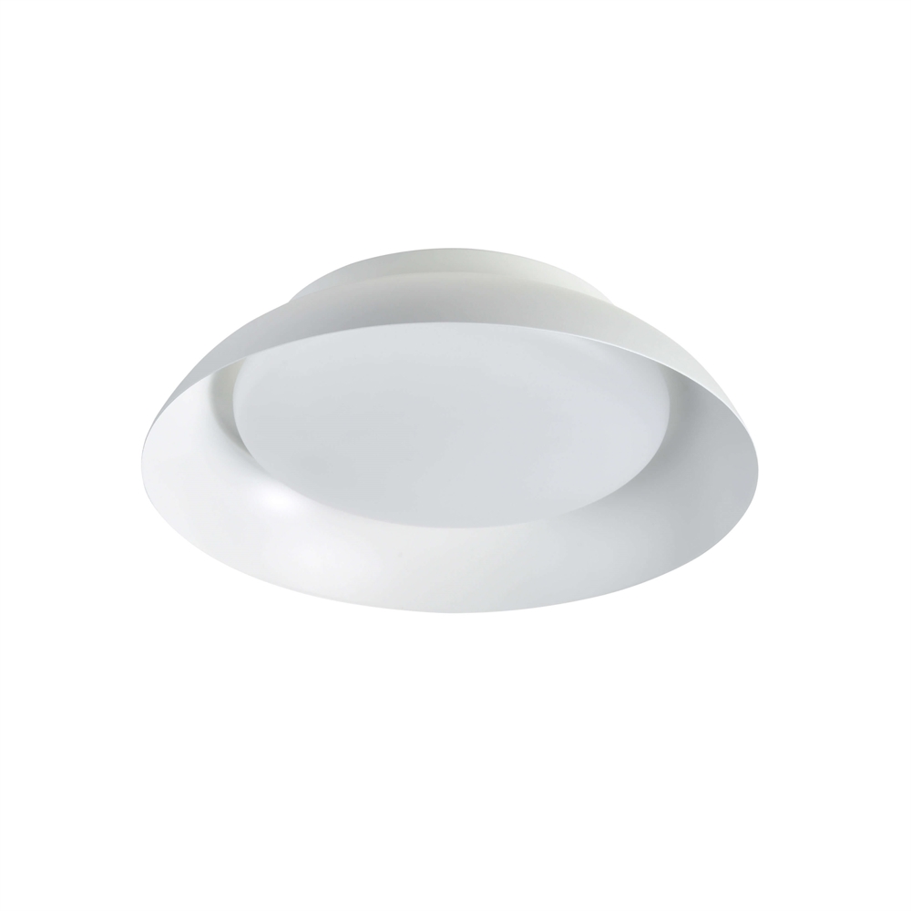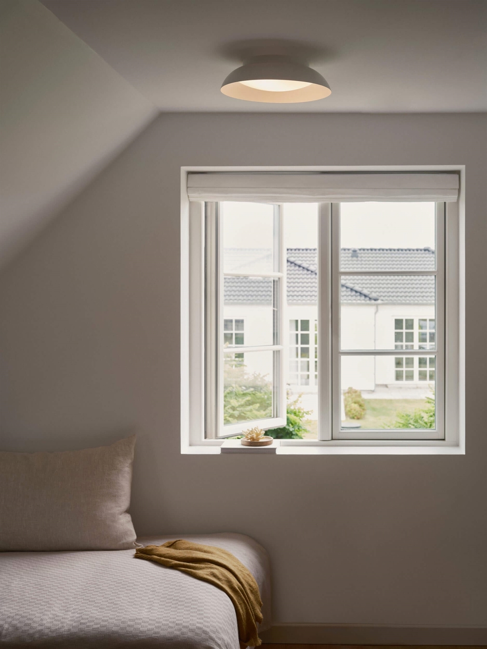 Nivora 38 met E27-fitting kan worden gebruikt als plafondlamp of wandlamp enheeft een brede, gebogen kap met een matwitte afwerking. Het ontwerp zorgt voor een gelijkmatig en aangenaam niet-verblindend licht in de ruimte en maakt de lamp ideaal voor de woonkamer, slaapkamer of hal.