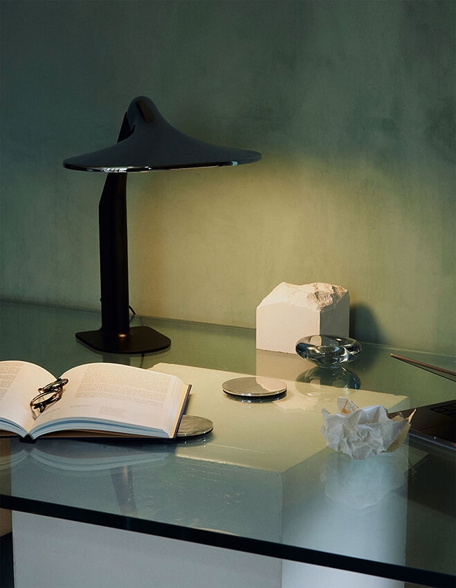 Het prachtige en unieke ontwerp van de lamp is geïnspireerd op de Japanse dennenboom, waar precisie en eenvoud centraal staan. Niwaki is een kunstmatige plant, waar de naam van de lamp ook vandaan komt. De afwerking van de tafellamp weerspiegelt bescheidenheid en de grote kap van de lamp zorgt voor goed licht. Daarom is het essentieel om deze op het bureau te gebruiken als leeslamp.