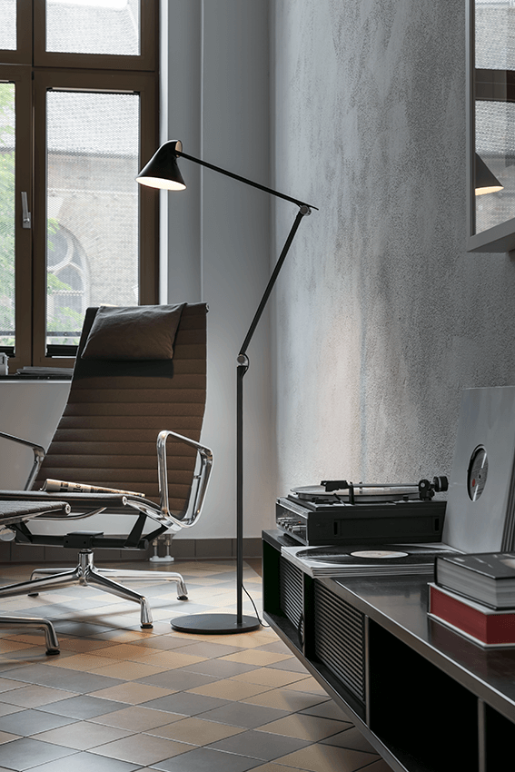 De NJP lampenserie is een moderne herinterpretatie van de klassieke architectenlamp. De vloerlamp heeft een uiterst functioneel ontwerp, waarbij zowel de kap als de armen verstelbaar zijn, zodat het licht naar behoefte kan worden aangepast.