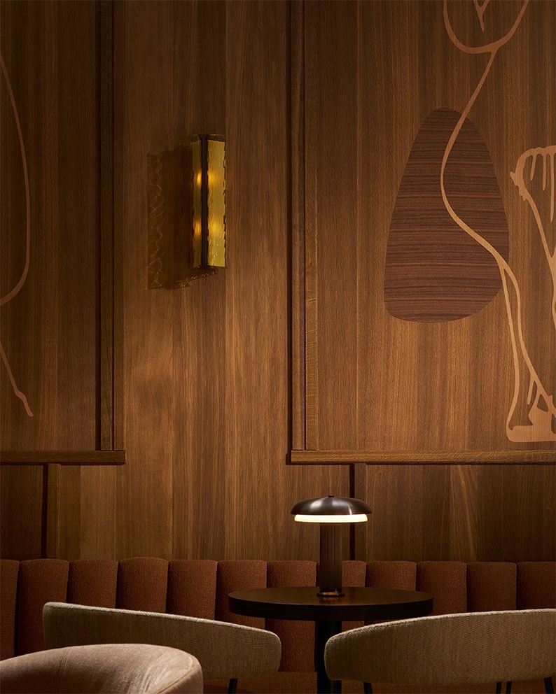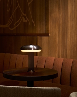 De draagbare tafellamp Noote heeft een zacht en overwegend indirect licht dat een warme sfeer creëert. De oplaadbare batterijlamp is ontworpen voor de intieme sfeer in het gecombineerde restaurant en jazzclub Epicurus in Kopenhagen en is, geïnspireerd door jazz, een mix van nostalgie en moderniteit met een tijdloze elegantie van het design uit de jaren 1930 in een moderne interpretatie.