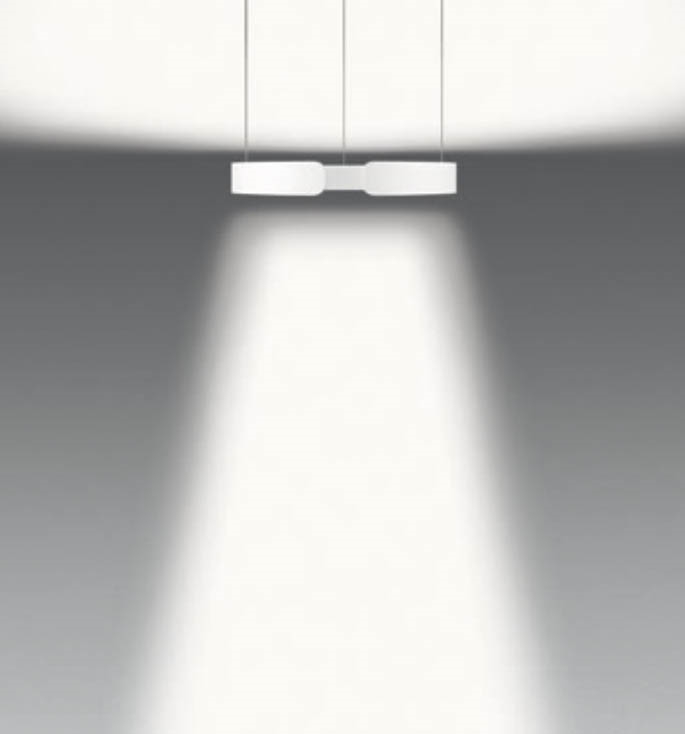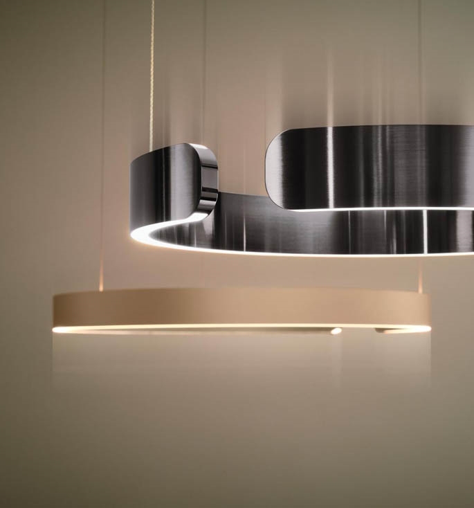 De luxueuze hanglamp is verkrijgbaar met zowel brede lichtverdeling, ideaal boven een tafel, als met smalle lichtverdeling, die beter geschikt is om hoog te hangen - als algemene ruimteverlichting.