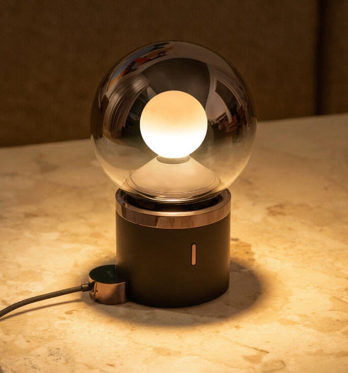De Luna Pura tafellamp heeft een zacht en verblindingsvrij licht en is geïntroduceerd door Occhio in 2024. Hij kan worden bediend via de basis of via app of controller dankzij 'Occhio air'.