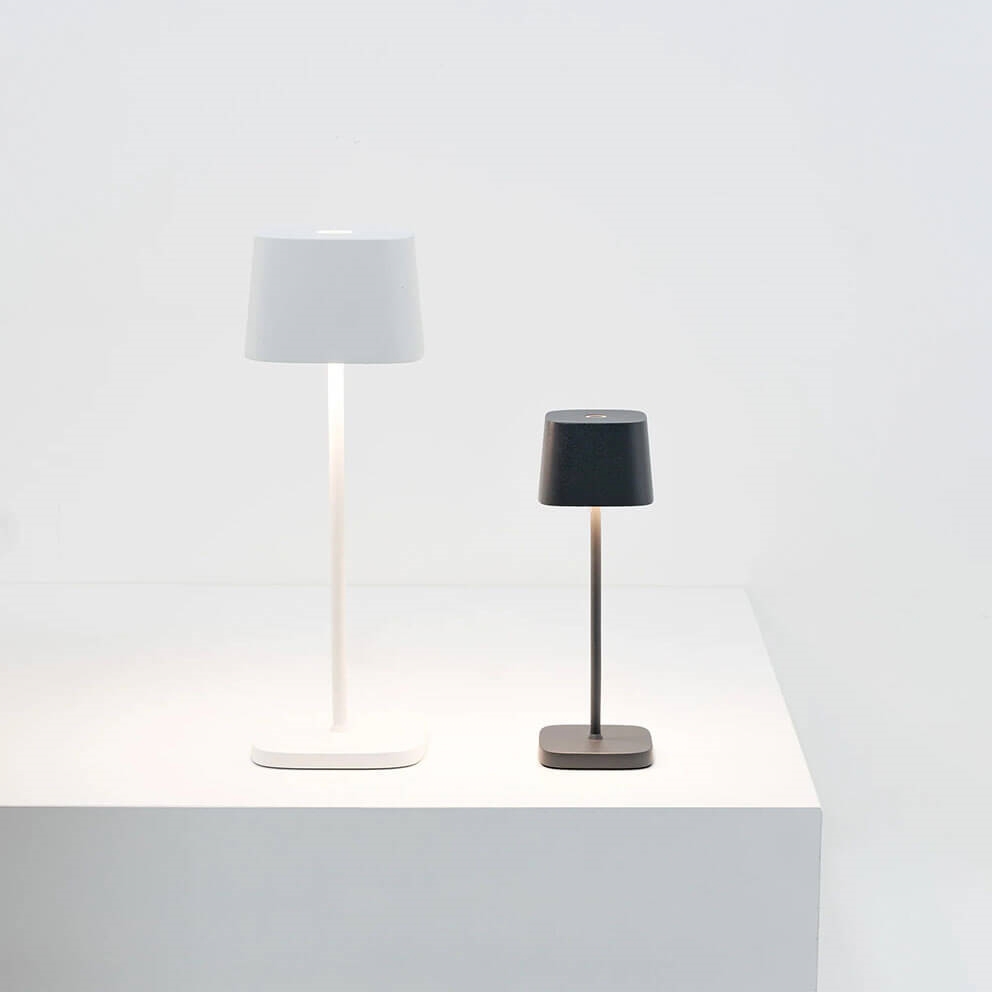 De oplaadbare batterijlamp Ofelia is gemaakt van gegoten aluminium en kan dankzij de IP65-classificatie zowel binnen als buiten worden gebruikt. De draagbare tafellamp is gemakkelijk mee te nemen en kan in helderheid worden gedimd, zodat het licht past bij de gewenste sfeer via een touch-functie bovenop de kap. Hier kan ook de kleurtemperatuur worden gekozen op 2200K, 2700K of 3000K. Een geheugenfunctie onthoudt de instellingen wanneer de lamp weer wordt ingeschakeld.