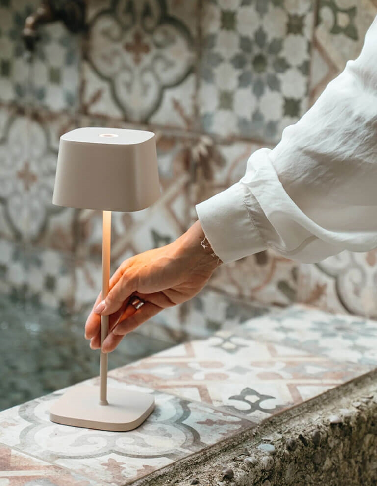 De oplaadbare batterijlamp Ofelia is gemaakt van gegoten aluminium en kan dankzij de IP65-classificatie zowel binnen als buiten worden gebruikt. De draagbare tafellamp is gemakkelijk mee te nemen en kan worden gedimd om de lichtsterkte aan te passen aan de gewenste sfeer via een touch-functie bovenop de kap. Hier kan ook de kleurtemperatuur worden gekozen: 2200K, 2700K of 3000K. Een geheugenfunctie onthoudt de instellingen wanneer de lamp weer wordt ingeschakeld.