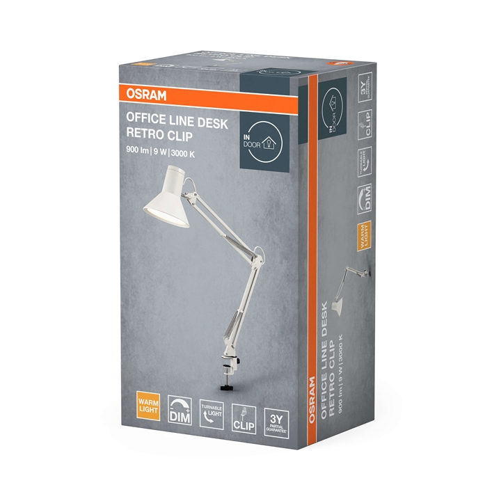 De geïntegreerde LED-lichtbron zorgt voor een goed en gelijkmatig licht met een laag energieverbruik en lange levensduur. De combinatie van functioneel ontwerp en klassieke vormgeving maakt de Office Line Desk Retro Clip geschikt voor zowel moderne als meer traditionele interieurs.