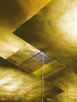 De indrukwekkende Oh Mei Ma Kabir hanglamp bestaat uit zes vellen papieren bladgoud en een gewicht van plexiglas.