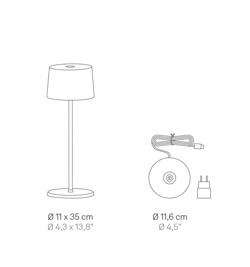 De oplaadbare tafellamp Olivia heeft een stijlvol design met een klassiek lampenkap op een slanke steel met een discrete basis. De batterijlamp is gemakkelijk mee te nemen en kan in sterkte worden gedimd, zodat het licht past bij de gewenste sfeer. Dimmen gebeurt via een touch-functie bovenop de kap, waar ook de kleurtemperatuur kan worden gekozen op 2200K, 2700K of 3000K. Een geheugenfunctie onthoudt de instellingen wanneer de lamp weer wordt ingeschakeld.