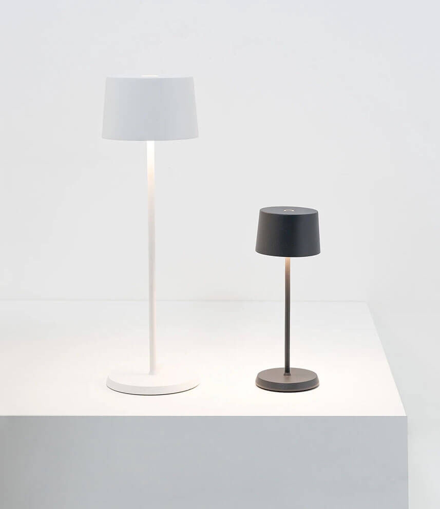 Olivia in wit en Olivia micro in grijsOlivia batterijlamp, corten