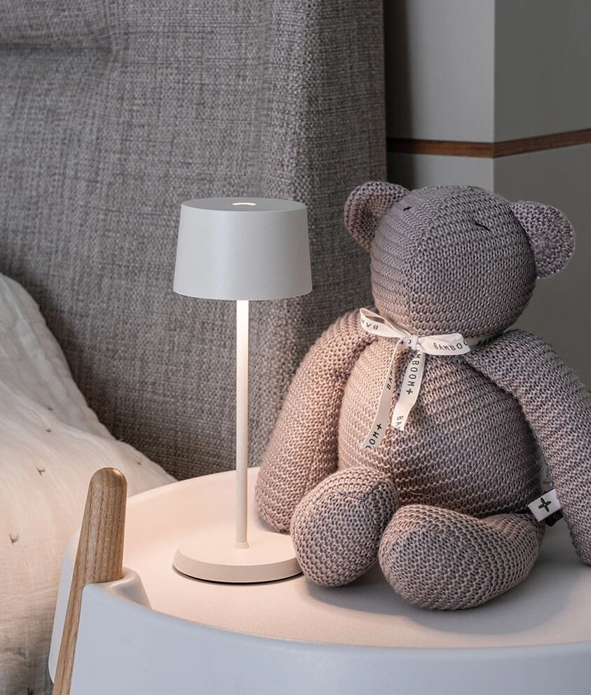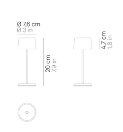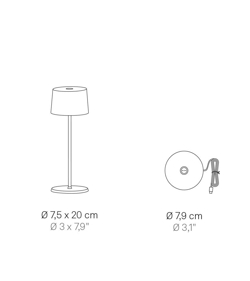 De batterijlamp Olivia micro is een kleinere versie van de populaire draagbare tafellamp Olivia. De kleine oplaadbare lamp kan dankzij zijn IP65-classificatie zowel binnen als buiten worden gebruikt.