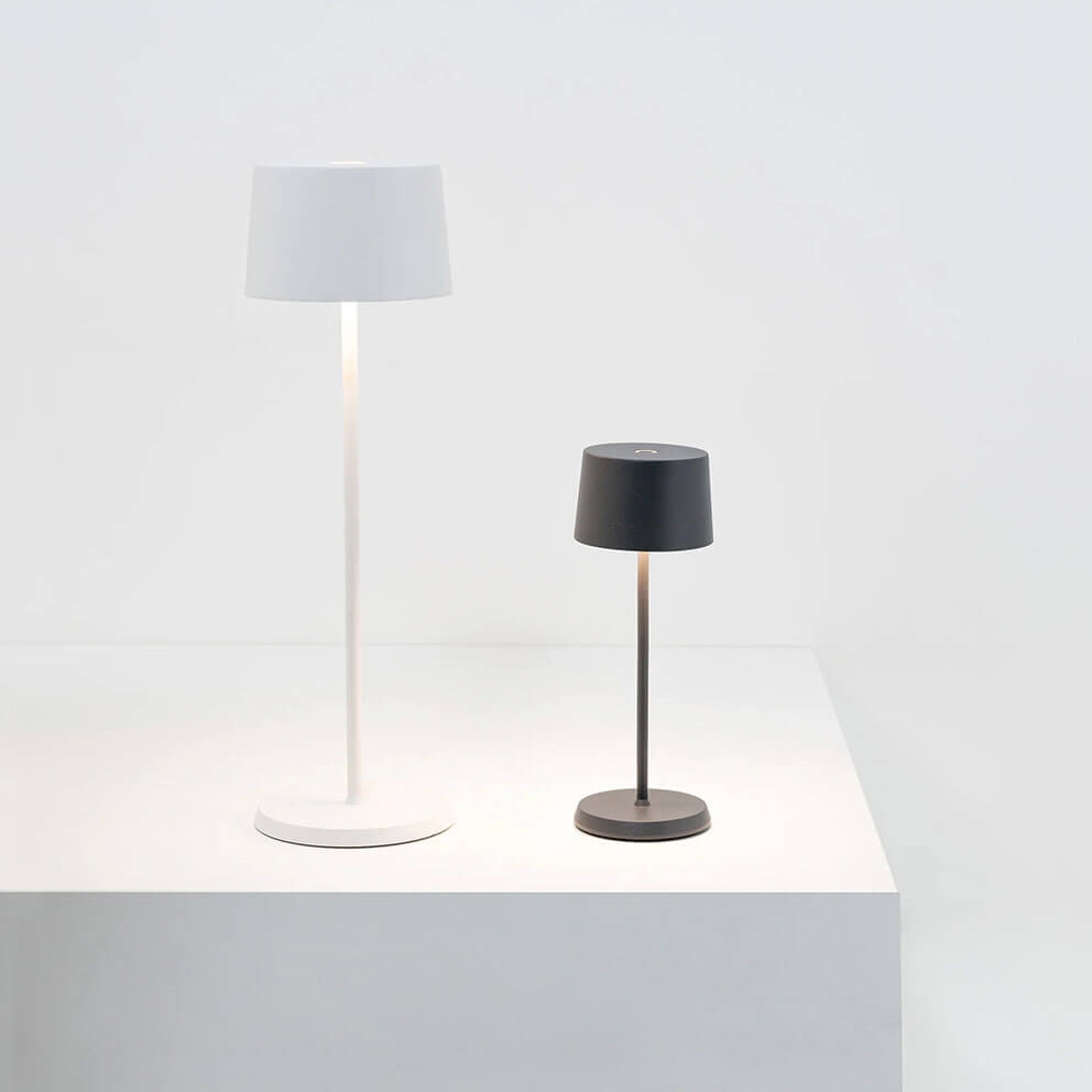 De batterijlamp Olivia micro is een kleinere versie van de populaire draagbare tafellamp Olivia. De kleine oplaadbare lamp kan dankzij zijn IP65-classificatie zowel binnen als buiten worden gebruikt.