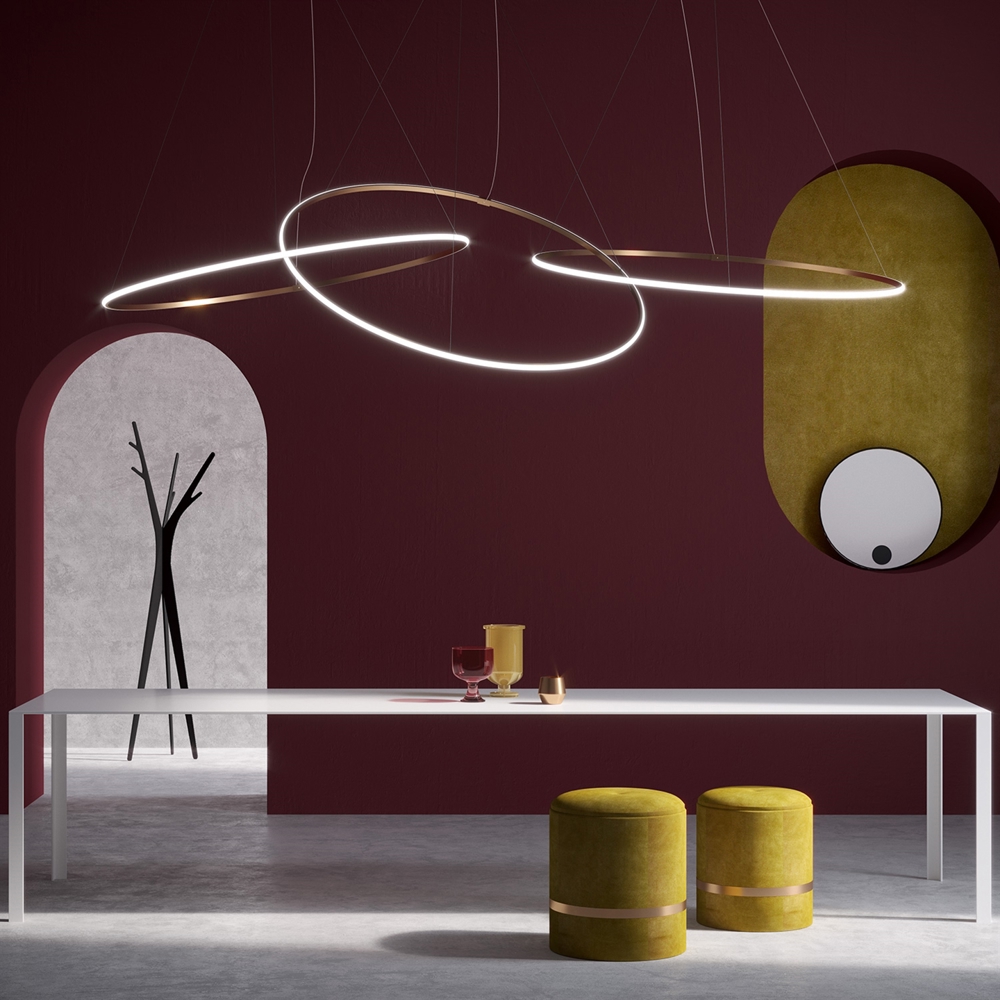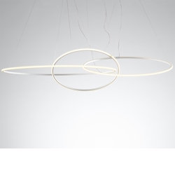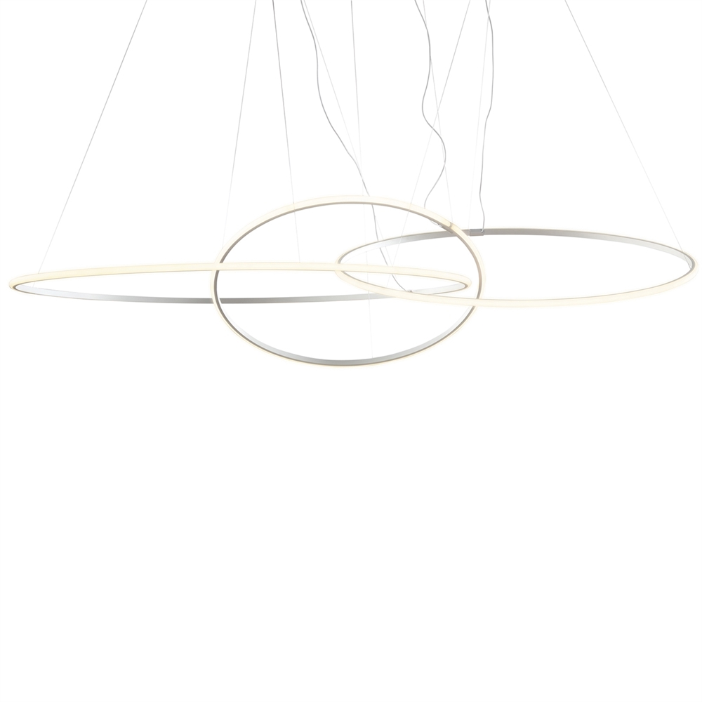 De Olympic hanglamp bestaat uit 3 samengestelde ringen, die op verschillende hoogtes en hoeken kunnen worden opgehangen om een uniek effect in een grote ruimte te creëren.