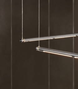 Oneline is geïnspireerd door de zuivere vormen in het meubeldesign van Poul Kjærholm. De unieke hanglamp is verkrijgbaar in roestvrij staal, geborsteld messing of in zwart PVD. De lamp en lichtbron kunnen 360 graden draaien en lijken, met hun stroomvoerende draden, draadloos en zwevend in de lucht.